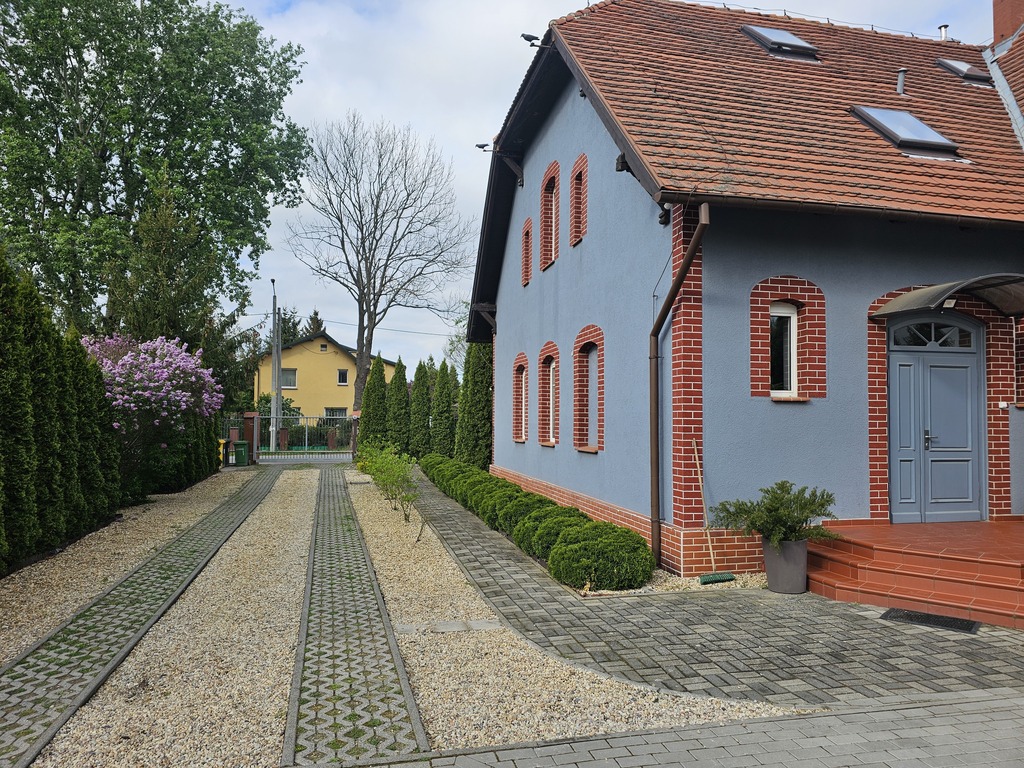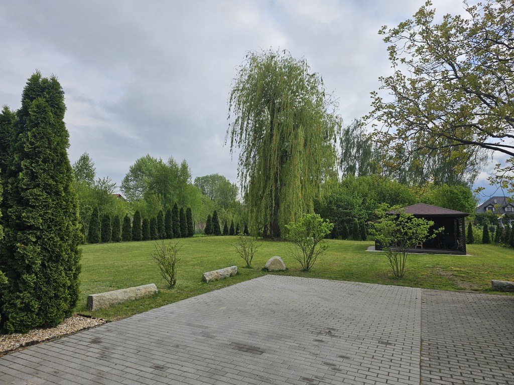 Działka wokoło domu jest w pełni zagospodarowana, znajduje się na niej bardzo dużo pięknych krzewów i drzew. Cały teren jest ogrodzony oraz posesja posiada 2 bramy wjazdowe po obu stronach budynku.