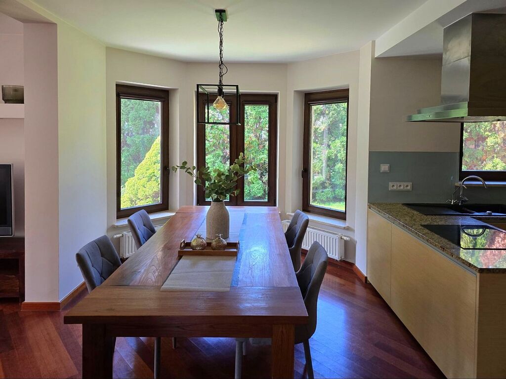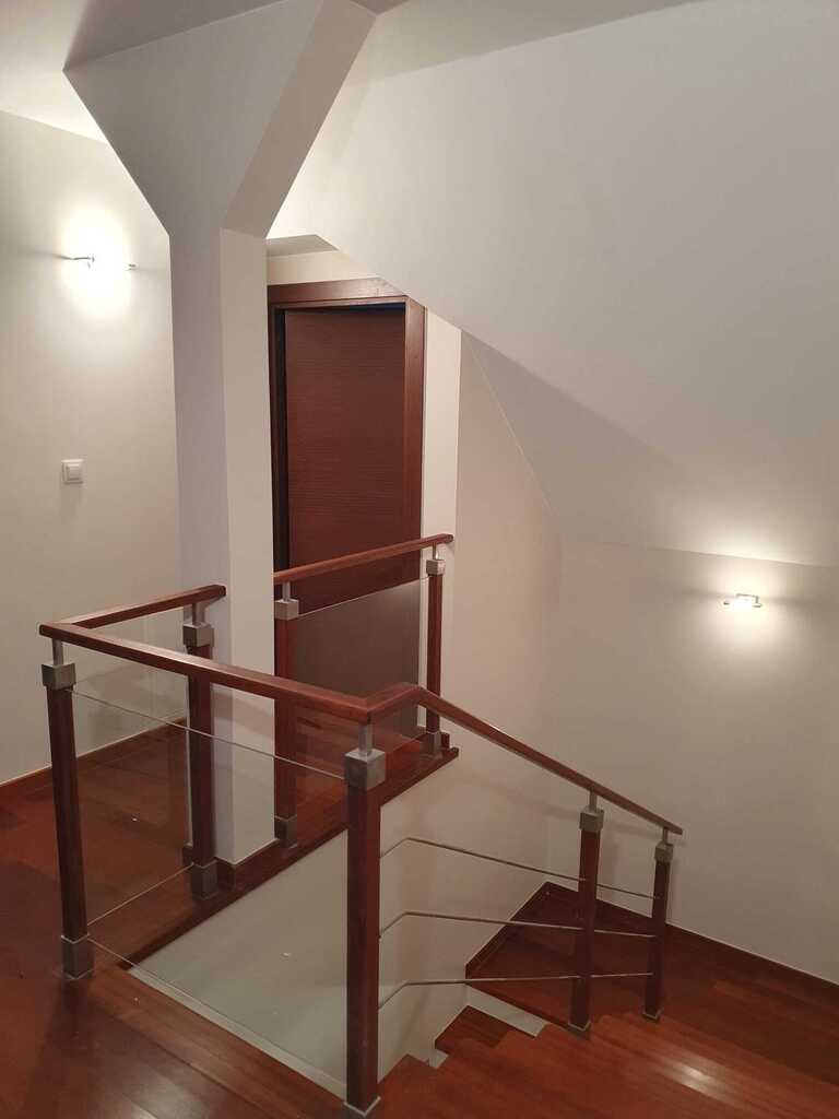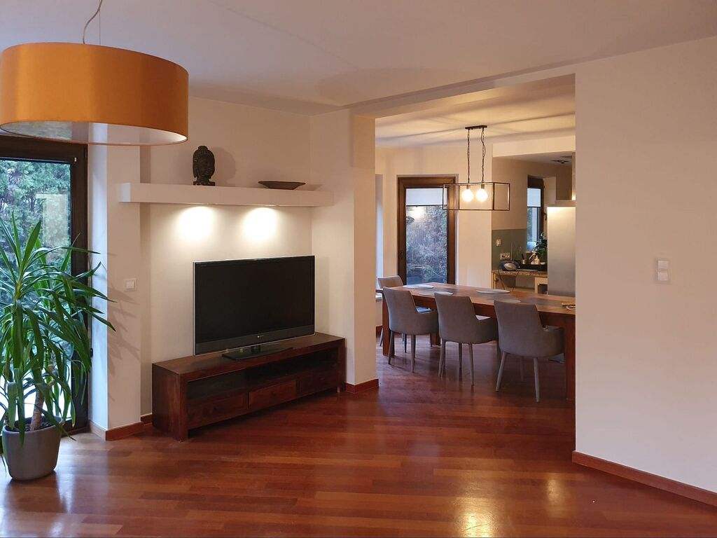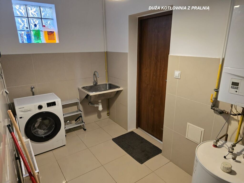 Nieruchomość składa się łącznie z 6 pokoi, 2 łazienek, garażu dwustanowiskowego, dużej kotłowni z pralnią. W całym domu znajduje się dużo specjalnie zaprojektowanej i stworzonej zabudowy pod postacią sufitów podwieszanych, szaf, półek, wnęk. Zadbano także o różnorodne oświetlenie pomieszczeń (punktowe, kinkiety, górne) tworząc w ten sposób wyjątkową atmosferę o każdej porze. W salonie znajduje się wykusz z oknami cudownie doświetlający przestrzeń jadalniano-kuchenną. Na podłogach w całym domu została położona deska z drewna egzotycznego oraz gres (w zależności od funkcji pomieszczenia). Z tego samego drewna wykonano zabudowę schodów oraz poręcze. Wewnątrz domu znajduje się instalacja alarmowa oraz sterownik do centralnej obsługi ogrzewania.
